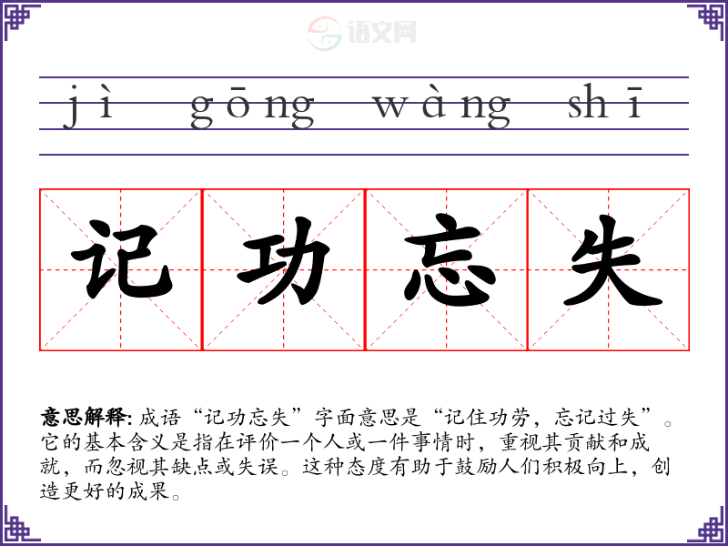 成语“记功忘失”字面意思是“记住功劳,忘记过失”。它的基本含义是指在评价一个人或一件事情时,重视其贡献和成就,而忽视其缺点或失误。这种态度有助于鼓励人们积极向上,创造更好的成果。