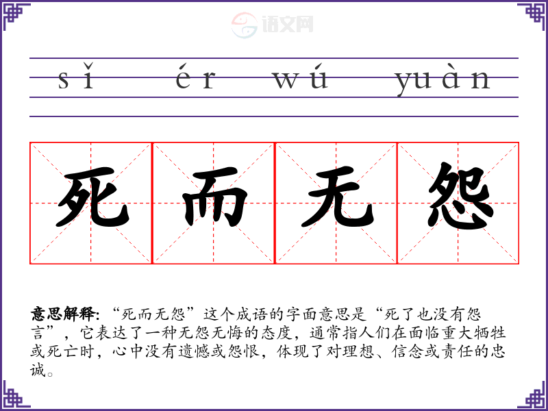 “死而无怨”这个成语的字面意思是“死了也没有怨言”,它表达了一种无怨无悔的态度,通常指人们在面临重大牺牲或死亡时,心中没有遗憾或怨恨,体现了对理想、信念或责任的忠诚。