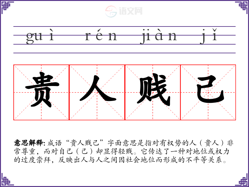 成语“贵人贱己”字面意思是指对有权势的人(贵人)非常尊重,而对自己(己)却显得轻贱。它传达了一种对地位或权力的过度崇拜,反映出人与人之间因社会地位而形成的不平等关系。