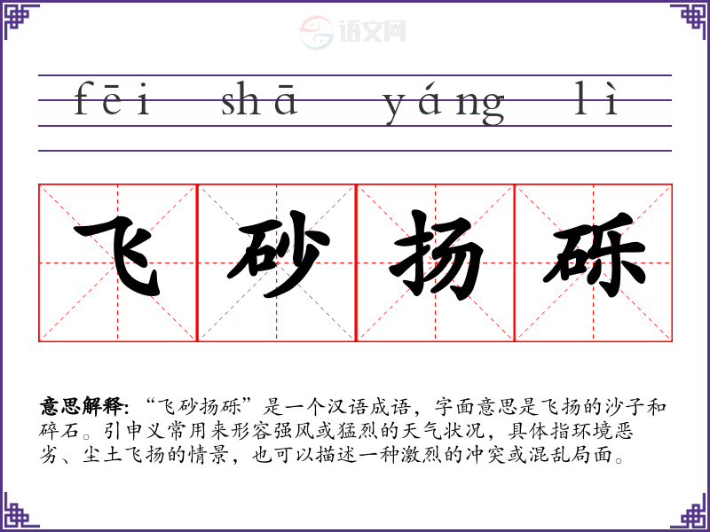 “飞砂扬砾”是一个汉语成语,字面意思是飞扬的沙子和碎石。引申义常用来形容强风或猛烈的天气状况,具体指环境恶劣、尘土飞扬的情景,也可以描述一种激烈的冲突或混乱局面。