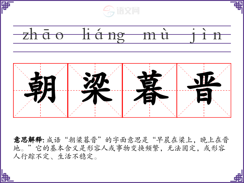 成语“朝梁暮晋”的字面意思是“早晨在梁上,晚上在晋地。”它的基本含义是形容人或事物变换频繁,无法固定,或形容人行踪不定、生活不稳定。
