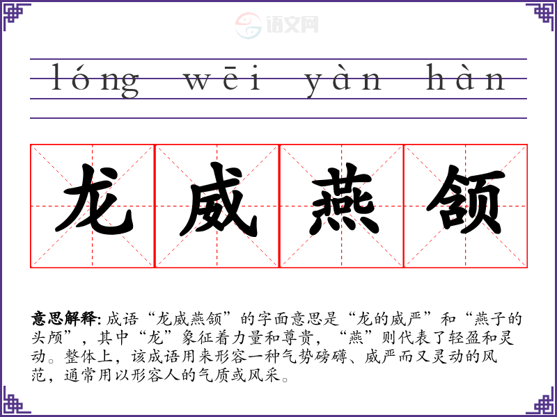 成语“龙威燕颔”的字面意思是“龙的威严”和“燕子的头颅”,其中“龙”象征着力量和尊贵,“燕”则代表了轻盈和灵动。整体上,该成语用来形容一种气势磅礴、威严而又灵动的风范,通常用以形容人的气质或风采。