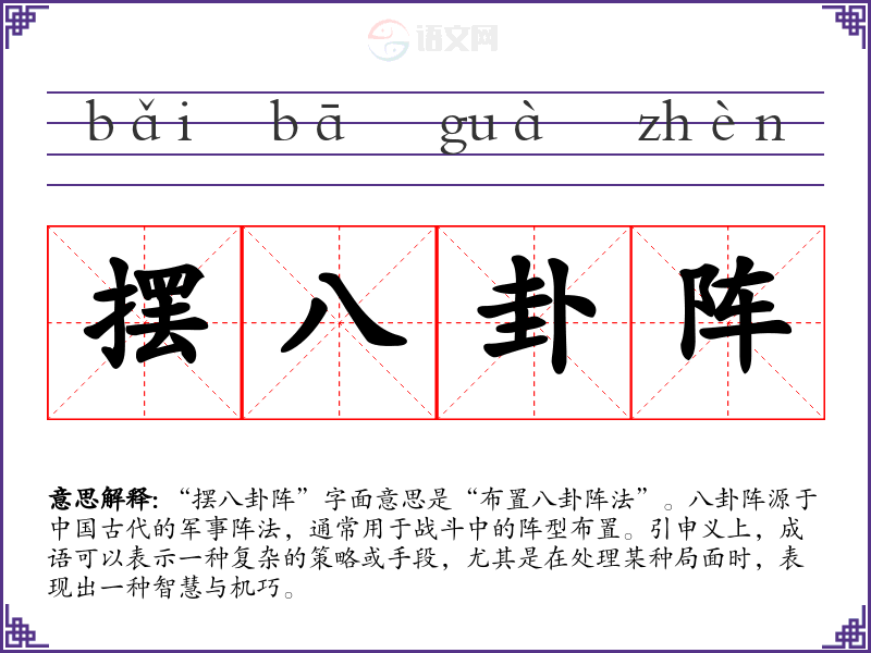 “摆八卦阵”字面意思是“布置八卦阵法”。八卦阵源于**古代的军事阵法,通常用于战斗中的阵型布置。引申义上,成语可以表示一种复杂的策略或手段,尤其是在处理某种局面时,表现出一种智慧与机巧。