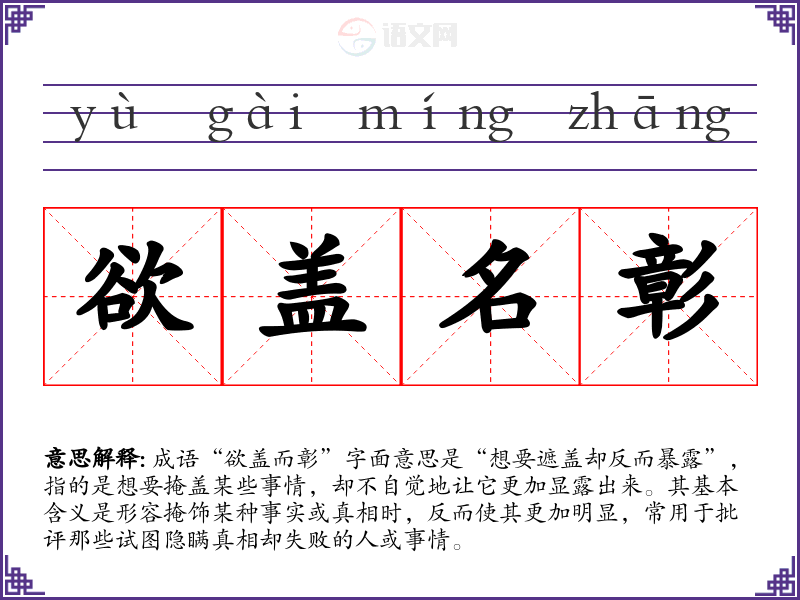 成语“欲盖而彰”字面意思是“想要遮盖却反而暴露”,指的是想要掩盖某些事情,却不自觉地让它更加显露出来。其基本含义是形容掩饰某种事实或真相时,反而使其更加明显,常用于批评那些试图隐瞒真相却失败的人或事情。