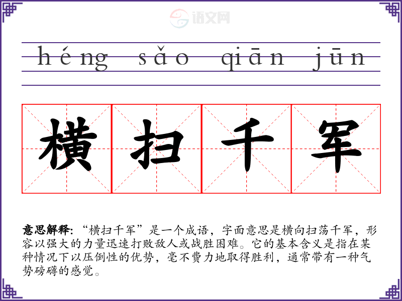“横扫千军”是一个成语,字面意思是横向扫荡千军,形容以强大的力量迅速打败敌人或战胜困难。它的基本含义是指在某种情况下以压倒性的优势,毫不费力地取得胜利,通常带有一种气势磅礴的感觉。