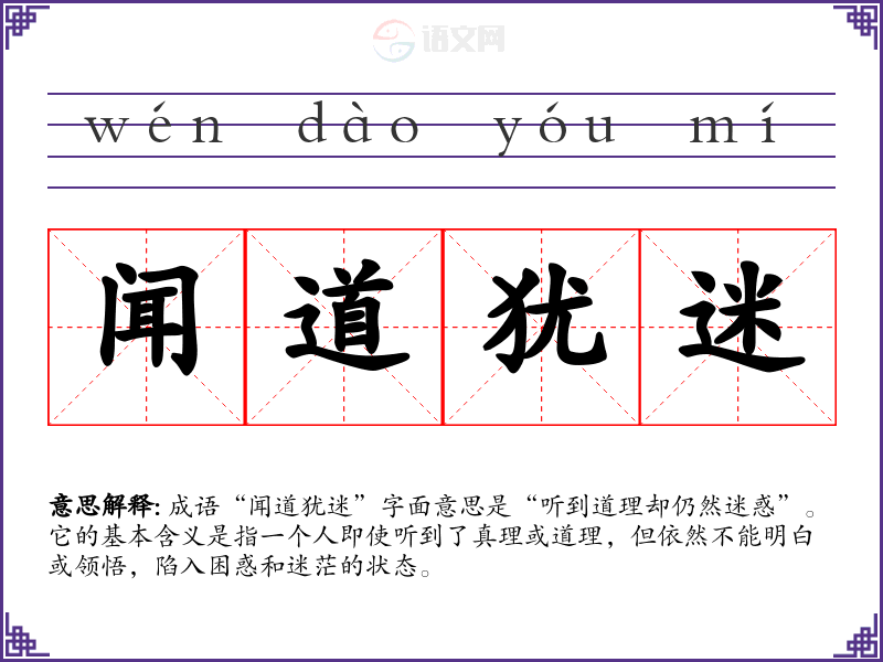 成语“闻道犹迷”字面意思是“听到道理却仍然迷惑”。它的基本含义是指一个人即使听到了真理或道理,但依然不能明白或领悟,陷入困惑和迷茫的状态。
