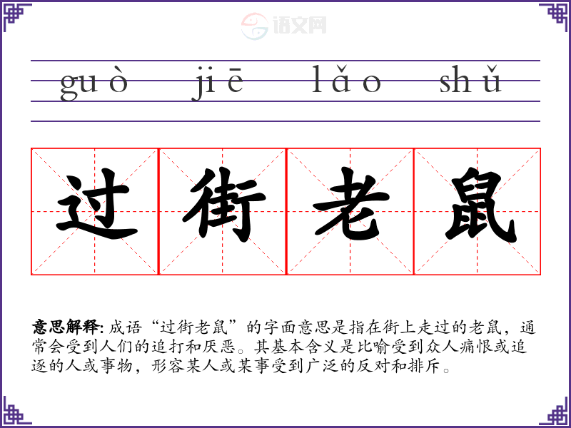 成语“过街老鼠”的字面意思是指在街上走过的老鼠,通常会受到人们的追打和厌恶。其基本含义是比喻受到众人痛恨或追逐的人或事物,形容某人或某事受到广泛的反对和排斥。
