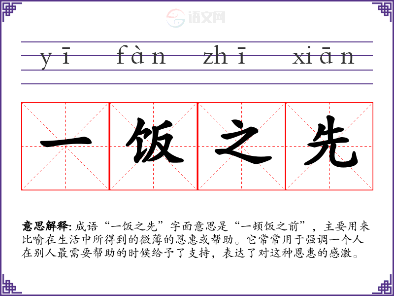 成语“一饭之先”字面意思是“一顿饭之前”,主要用来比喻在生活中所得到的微*的恩惠或帮助。它常常用于强调一个人在别人最需要帮助的时候给予了支持,表达了对这种恩惠的感激。