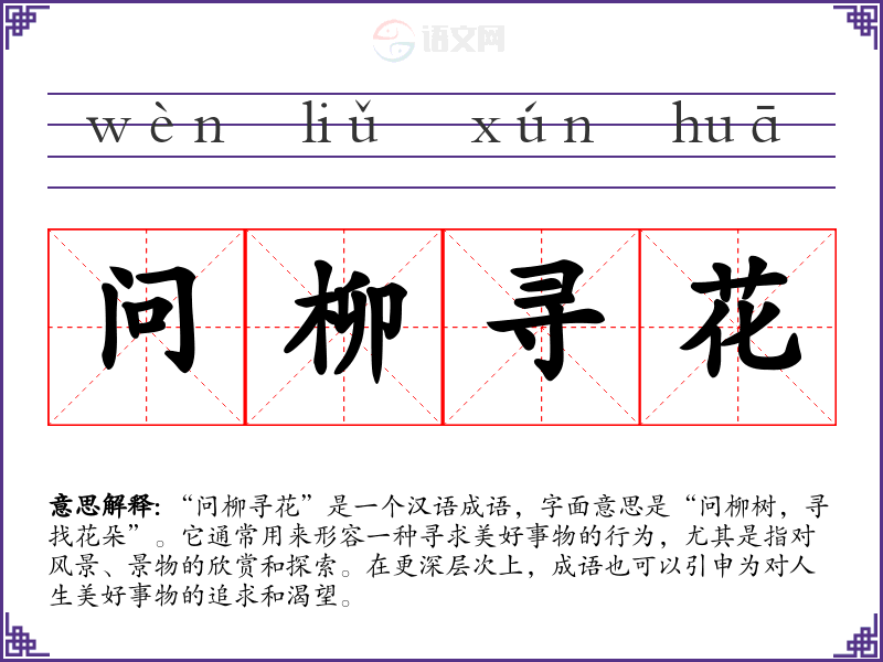 “问柳寻花”是一个汉语成语,字面意思是“问柳树,寻找花朵”。它通常用来形容一种寻求美好事物的行为,尤其是指对风景、景物的欣赏和探索。在更深层次上,成语也可以引申为对人生美好事物的追求和渴望。