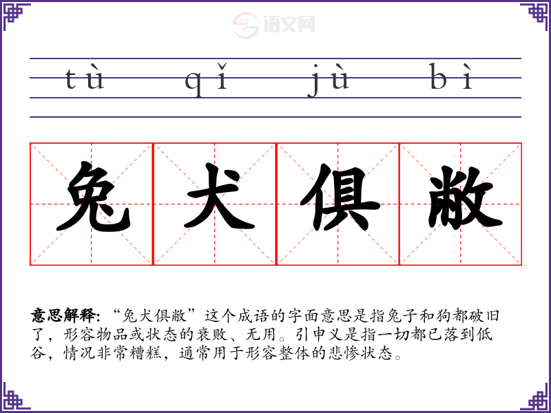 “兔犬俱敝”这个成语的字面意思是指兔子和狗都破旧了,形容物品或状态的衰败、无用。引申义是指一切都已落到低谷,情况非常糟糕,通常用于形容整体的悲惨状态。