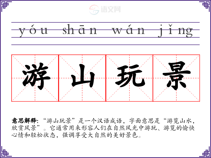 “游山玩景”是一个汉语成语,字面意思是“游览山水,欣赏风景”。它通常用来形容人们在自然风光中游玩、游览的愉快心情和轻松状态,强调享受大自然的美好景色。
