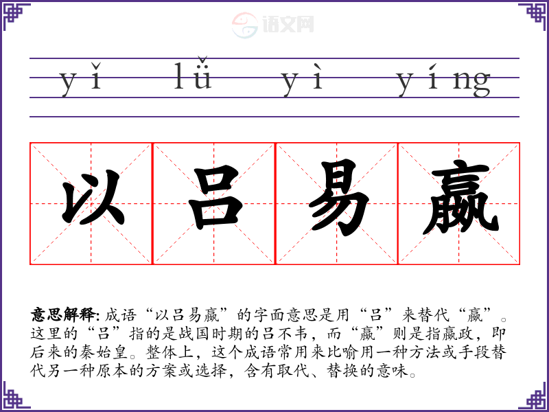 成语“以吕易嬴”的字面意思是用“吕”来替代“嬴”。这里的“吕”指的是战国时期的吕不韦,而“嬴”则是指嬴政,即后来的秦始皇。整体上,这个成语常用来比喻用一种方法或手段替代另一种原本的方案或选择,含有取代、替换的意味。