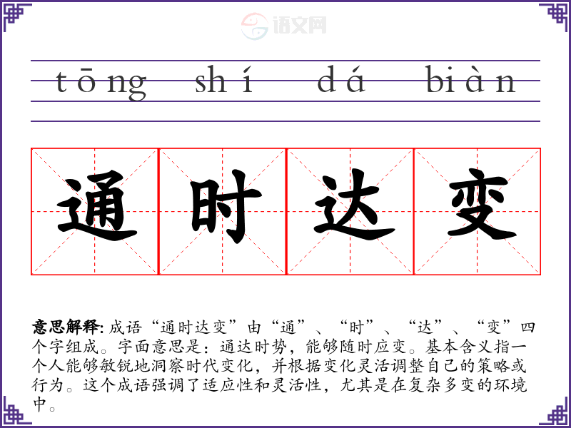 成语“通时达变”由“通”、“时”、“达”、“变”四个字组成。字面意思是:通达时势,能够随时应变。基本含义指一个人能够敏锐地洞察时代变化,并根据变化灵活调整自己的策略或行为。这个成语强调了适应性和灵活性,尤其是在复杂多变的环境中。