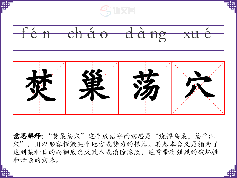 “焚巢荡穴”这个成语字面意思是“烧掉鸟巢,荡平洞穴”,用以形容摧毁某个地方或势力的根基。其基本含义是指为了达到某种目的而彻底消灭敌人或消除隐患,通常带有强烈的破坏性和清除的意味。