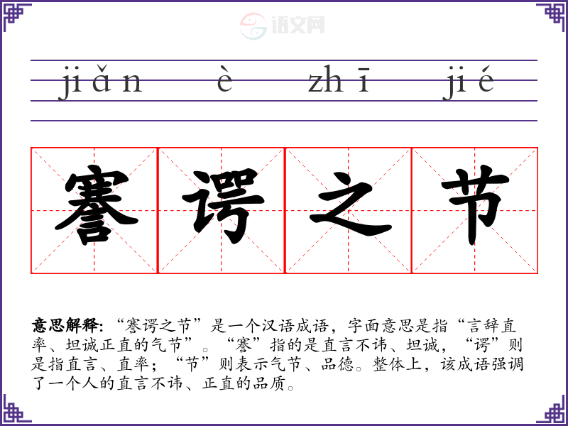 “謇谔之节”是一个汉语成语,字面意思是指“言辞直率、坦诚正直的气节”。“謇”指的是直言不讳、坦诚,“谔”则是指直言、直率;“节”则表示气节、品德。整体上,该成语强调了一个人的直言不讳、正直的品质。