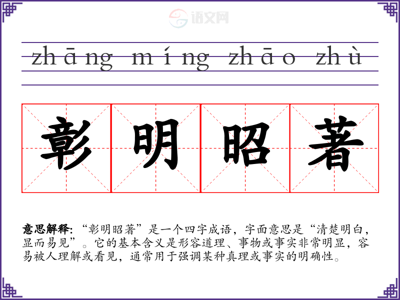 “彰明昭著”是一个四字成语,字面意思是“清楚明白,显而易见”。它的基本含义是形容道理、事物或事实非常明显,容易被人理解或看见,通常用于强调某种真理或事实的明确性。