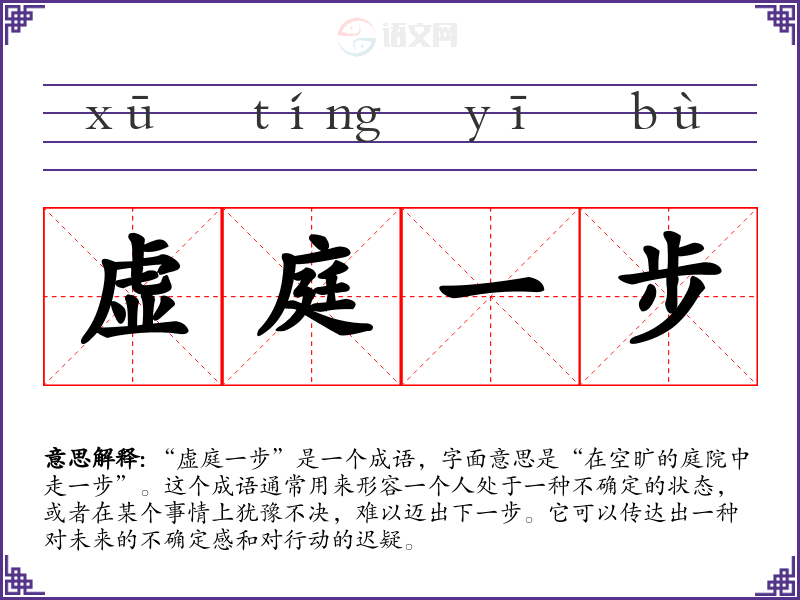 “虚庭一步”是一个成语,字面意思是“在空旷的庭院中走一步”。这个成语通常用来形容一个人处于一种不确定的状态,或者在某个事情上犹豫不决,难以迈出下一步。它可以传达出一种对未来的不确定感和对行动的迟疑。