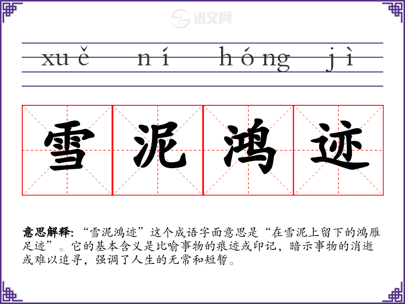“雪泥鸿迹”这个成语字面意思是“在雪泥上留下的鸿雁足迹”。它的基本含义是比喻事物的痕迹或印记,暗示事物的消逝或难以追寻,强调了人生的无常和短暂。