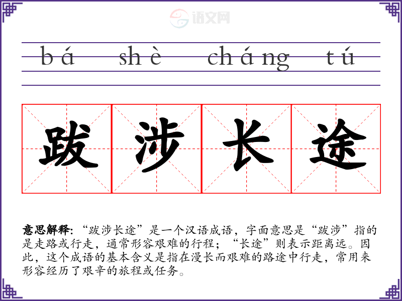 “跋涉长途”是一个汉语成语,字面意思是“跋涉”指的是走路或行走,通常形容艰难的行程;“长途”则表示距离远。因此,这个成语的基本含义是指在漫长而艰难的路途中行走,常用来形容经历了艰辛的旅程或任务。