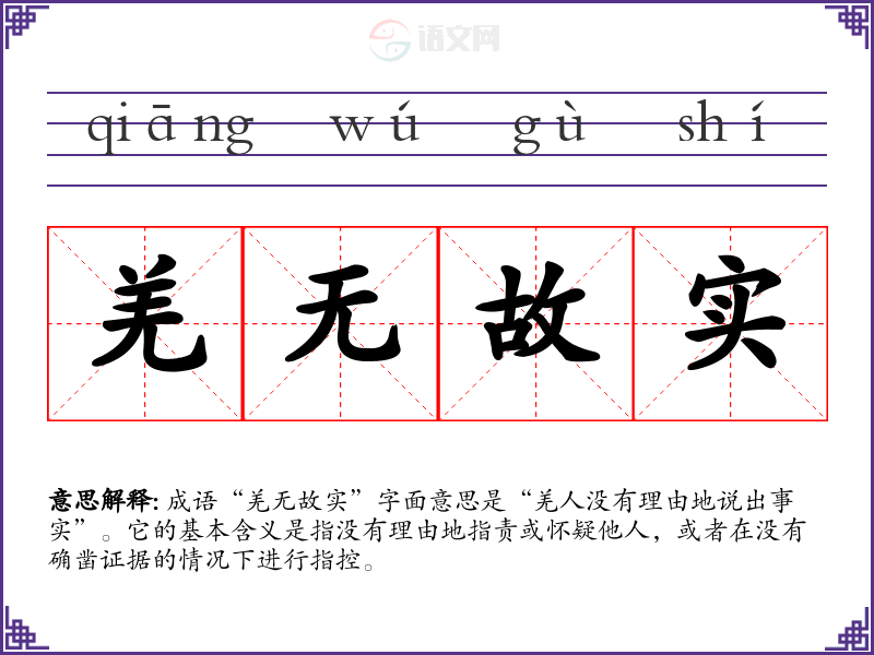 成语“羌无故实”字面意思是“羌人没有理由地说出事实”。它的基本含义是指没有理由地指责或怀疑他人,或者在没有确凿证据的情况下进行指控。