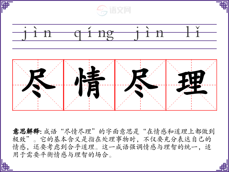 成语“尽情尽理”的字面意思是“在情感和道理上都做到极致”。它的基本含义是指在处理事物时,不仅要充分表达自己的情感,还要考虑到合乎道理。这一成语强调情感与理智的统一,适用于需要平衡情感与理智的场合。
