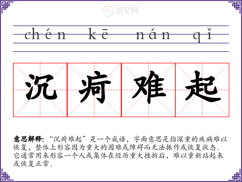 “沉疴难起”是一个成语,字面意思是指深重的疾病难以恢复,整体上形容因为重大的困难或障碍而无法振作或恢复状态。它通常用来形容一个人或集体在经历重大挫折后,难以重新站起来或恢复正常。