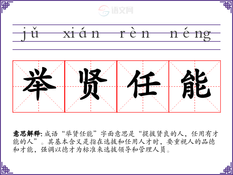 成语“举贤任能”字面意思是“提拔贤良的人,任用有才能的人”。其基本含义是指在选拔和任用人才时,要重视人的品德和才能,强调以德才为标准来选拔领导和管理人员。