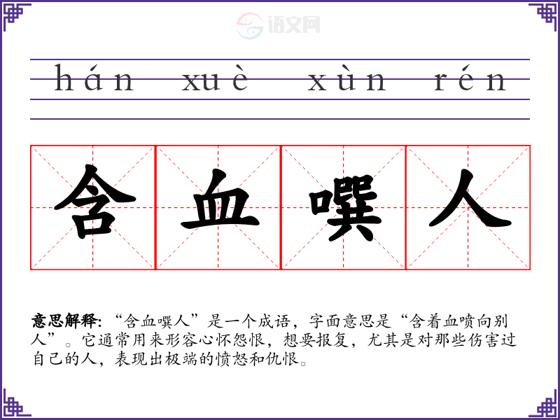 “含血噀人”是一个成语,字面意思是“含着血喷向别人”。它通常用来形容心怀怨恨,想要报复,尤其是对那些伤害过自己的人,表现出极端的愤怒和仇恨。