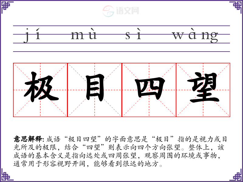 成语“极目四望”的字面意思是“极目”指的是视力或目光所及的极限,结合“四望”则表示向四个方向张望。整体上,该成语的基本含义是指向远处或四周张望,观察周围的环境或事物,通常用于形容视野开阔,能够看到很远的地方。