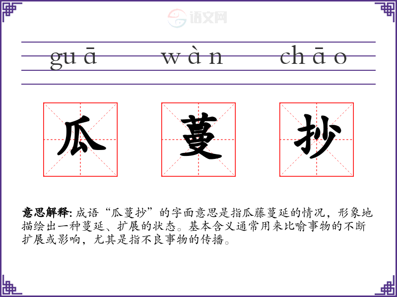 成语“瓜蔓抄”的字面意思是指瓜藤蔓延的情况,形象地描绘出一种蔓延、扩展的状态。基本含义通常用来比喻事物的不断扩展或影响,尤其是指不良事物的传播。