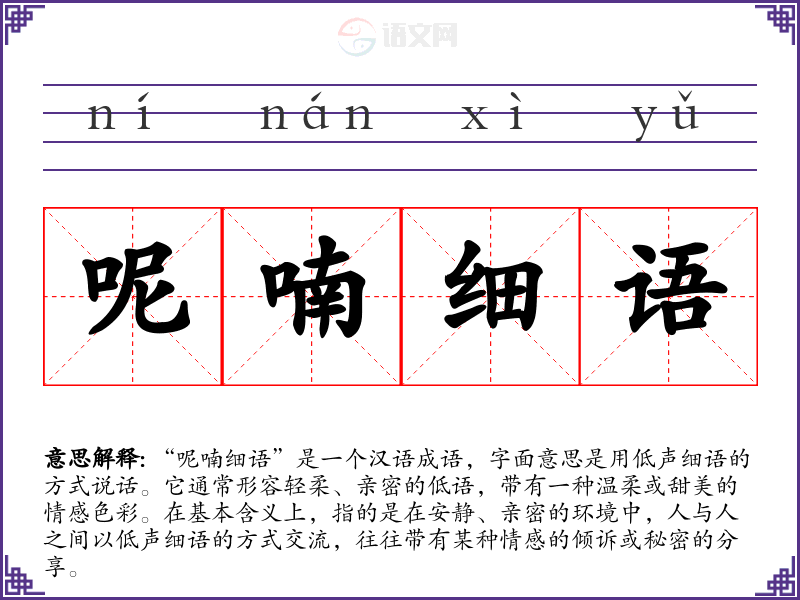 “呢喃”原本是形容鸟叫声的词汇,意指细微、轻柔的声音。此成语的具体出处并不明确,但在古代文学中常出现与低语、轻声交流相关的描写,反映了人们在情感交流中的细腻与亲密。