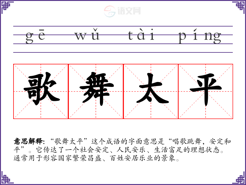 “歌舞太平”这个成语的字面意思是“唱歌跳舞,安定和平”。它传达了一个社会安定、人民安乐、生活富足的理想状态。通常用于形容国家繁荣昌盛、百姓安居乐业的景象。