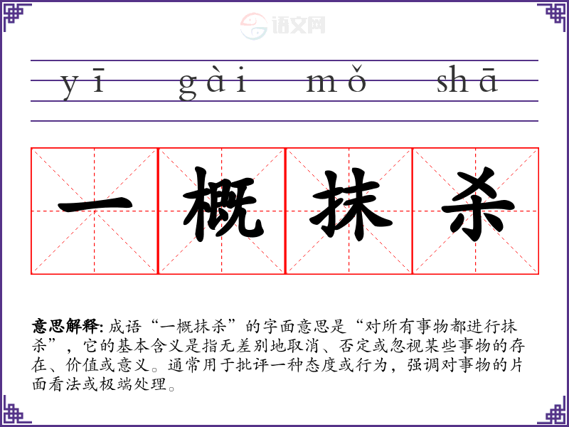 成语“一概抹杀”的字面意思是“对所有事物都进行抹杀”,它的基本含义是指无差别地取消、否定或忽视某些事物的存在、价值或意义。通常用于批评一种态度或行为,强调对事物的片面看法或极端处理。
