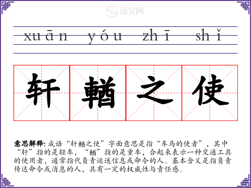 成语“轩輶之使”字面意思是指“车马的使者”,其中“轩”指的是轻车,“輶”指的是重车,合起来表示一种交通工具的使用者,通常指代负责运送信息或命令的人。基本含义是指负责传达命令或消息的人,具有一定的权威性与责任感。