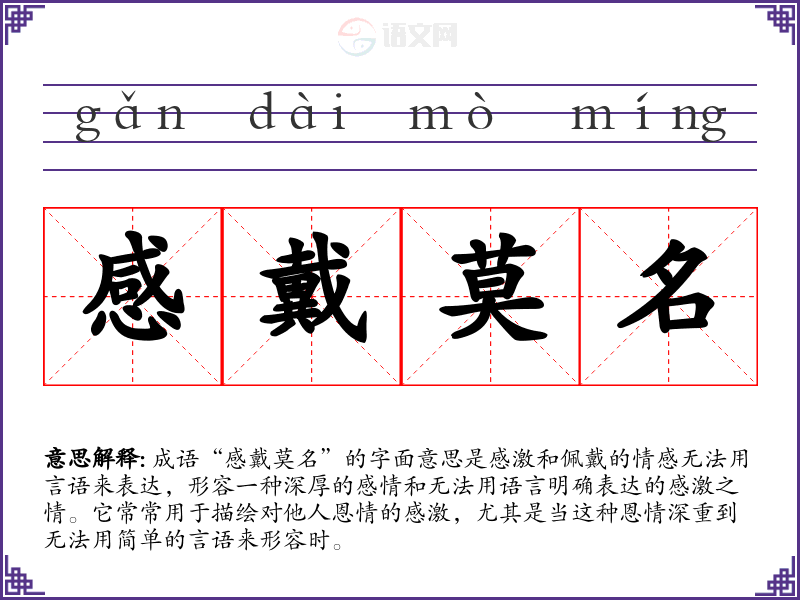 在文学作品中,“感戴莫名”可以用于描述人物对他人恩情的感激,例如在古典诗词中,常常可以见到类似的表达。在日常对话中,人们可以用它来形容自己对朋友、家人或恩师的感激之情。在演讲中,这个成语也可作为强调感恩主题的一个生动表达。