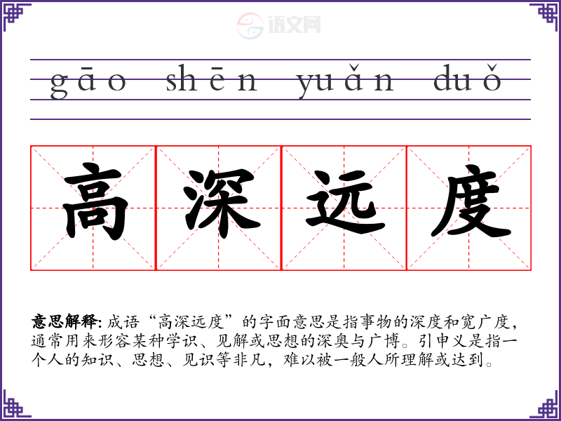 成语“高深远度”的字面意思是指事物的深度和宽广度,通常用来形容某种学识、见解或思想的深奥与广博。引申义是指一个人的知识、思想、见识等非凡,难以被一般人所理解或达到。