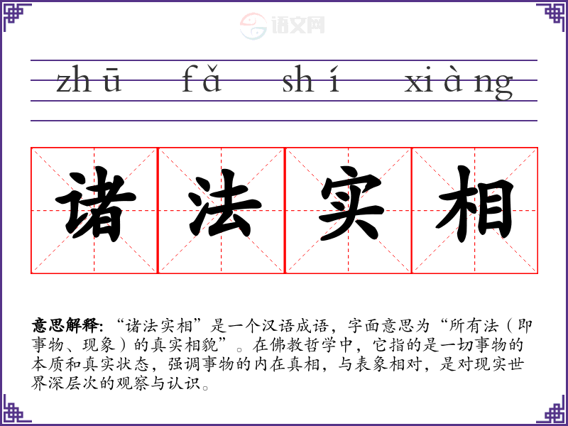“诸法实相”是一个汉语成语,字面意思为“所有法(即事物、现象)的真实相貌”。在**哲学中,它指的是一切事物的本质和真实状态,强调事物的内在真相,与表象相对,是对现实世界深层次的观察与认识。