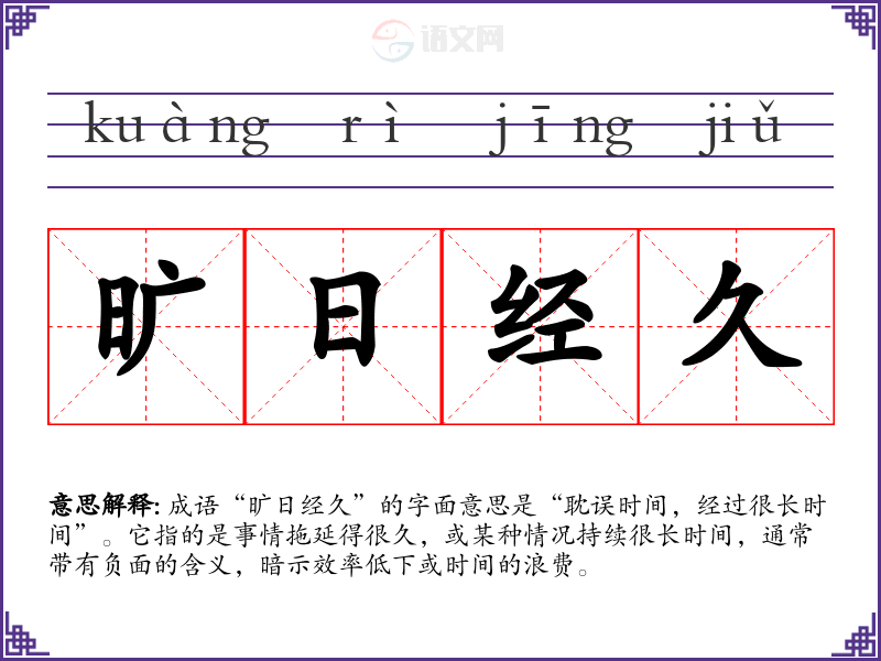 成语“旷日经久”的字面意思是“耽误时间,经过很长时间”。它指的是事情拖延得很久,或某种情况持续很长时间,通常带有负面的含义,暗示效率低下或时间的浪费。