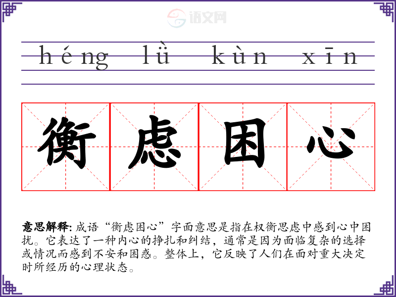 “衡虑困心”并没有明确的历史典故或文学出处,但其构成的词汇反映了传统文化中对内心困扰的深刻理解。汉字“衡”与“虑”常常与思考、考虑相关,而“困心”则直接表达了内心的挣扎和压抑。这种表达方式在古代文学中较为常见,强调了内心的复杂情感。