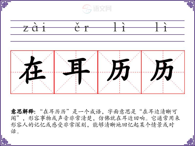 “在耳历历”是一个成语,字面意思是“在耳边清晰可闻”,形容事物或声音非常清楚,仿佛就在耳边回响。它通常用来形容人的记忆或感受非常深刻,能够清晰地回忆起某个情景或对话。