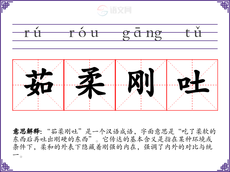 “茹柔刚吐”是一个汉语成语,字面意思是“吃了柔软的东西后再吐出刚硬的东西”。它传达的基本含义是指在某种环境或条件下,柔和的外表下隐藏着刚强的内在,强调了内外的对比与统一。