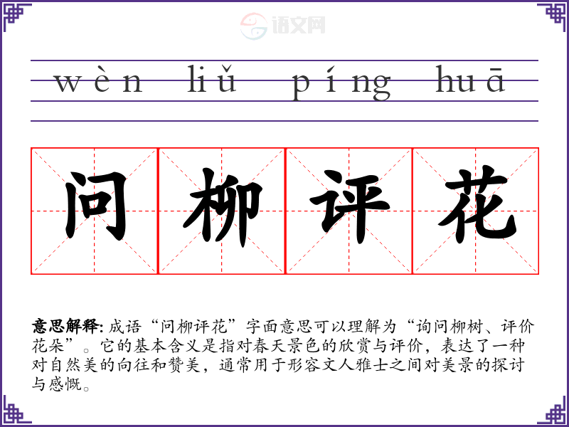 成语“问柳评花”字面意思可以理解为“询问柳树、评价花朵”。它的基本含义是指对春天景色的欣赏与评价,表达了一种对自然美的向往和赞美,通常用于形容文人雅士之间对美景的探讨与感慨。