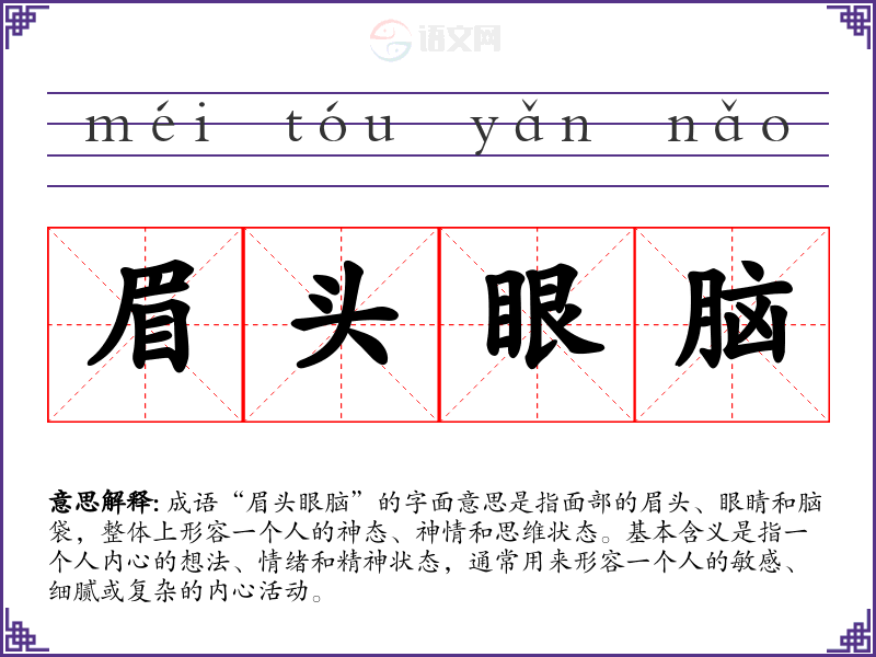 成语“眉头眼脑”的字面意思是指面部的眉头、眼睛和脑袋,整体上形容一个人的神态、神情和思维状态。基本含义是指一个人内心的想法、情绪和精神状态,通常用来形容一个人的敏感、细腻或复杂的内心活动。