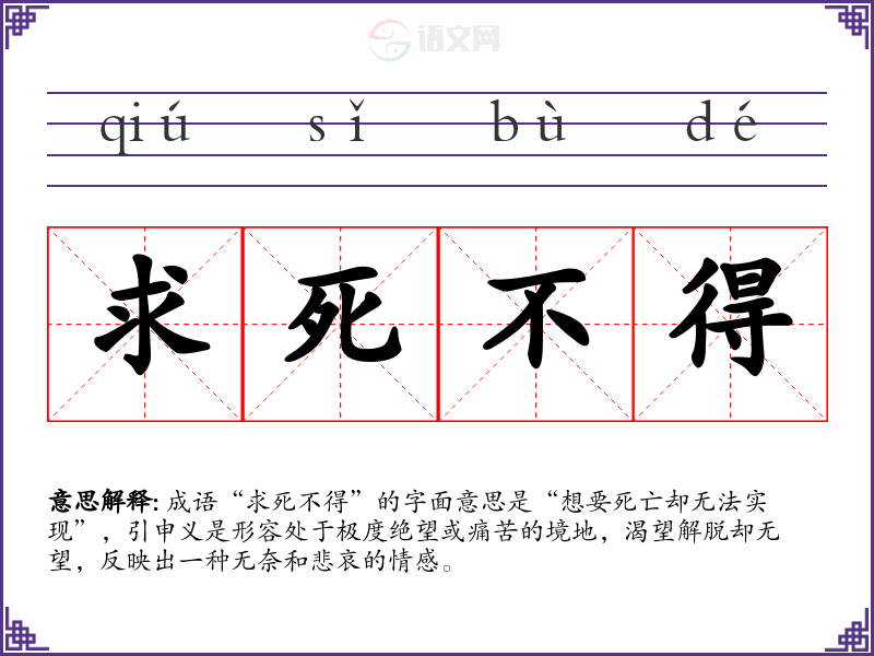 成语“求死不得”的字面意思是“想要死亡却无法实现”,引申义是形容处于极度绝望或痛苦的境地,渴望解脱却无望,反映出一种无奈和悲哀的情感。
