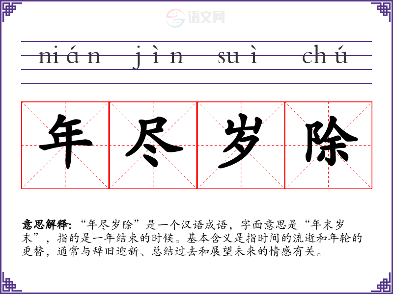 “年尽岁除”是一个汉语成语,字面意思是“年末岁末”,指的是一年结束的时候。基本含义是指时间的流逝和年轮的更替,通常与辞旧迎新、总结过去和展望未来的情感有关。