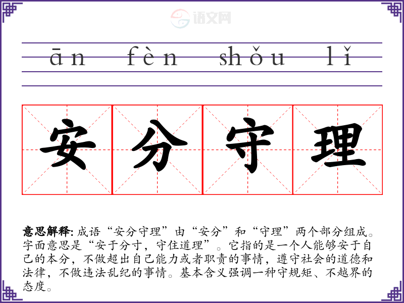 成语“安分守理”由“安分”和“守理”两个部分组成。字面意思是“安于分寸,守住道理”。它指的是一个人能够安于自己的本分,不做超出自己能力或者职责的事情,遵守社会的道德和法律,不做违法乱纪的事情。基本含义强调一种守规矩、不越界的态度。