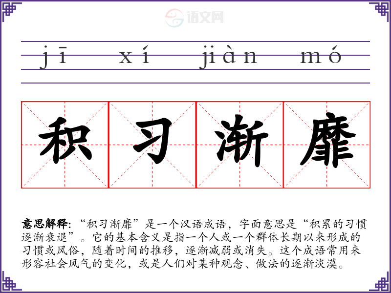 “积习渐靡”是一个汉语成语,字面意思是“积累的习惯逐渐衰退”。它的基本含义是指一个人或一个群体长期以来形成的习惯或风俗,随着时间的推移,逐渐减弱或消失。这个成语常用来形容社会风气的变化,或是人们对某种观念、做法的逐渐淡漠。