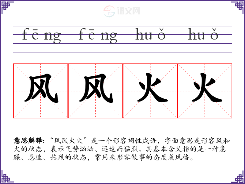 “风风火火”是一个形容词性成语,字面意思是形容风和火的状态,表示气势汹汹、迅速而猛烈。其基本含义指的是一种急躁、急速、热烈的状态,常用来形容做事的态度或风格。