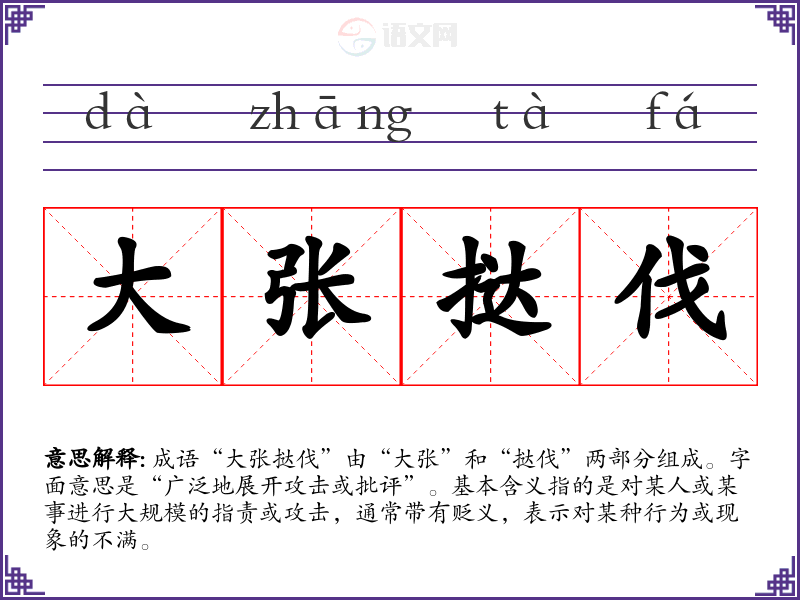成语“大张挞伐”由“大张”和“挞伐”两部分组成。字面意思是“广泛地展开攻击或批评”。基本含义指的是对某人或某事进行***的指责或攻击,通常带有贬义,表示对某种行为或现象的不满。