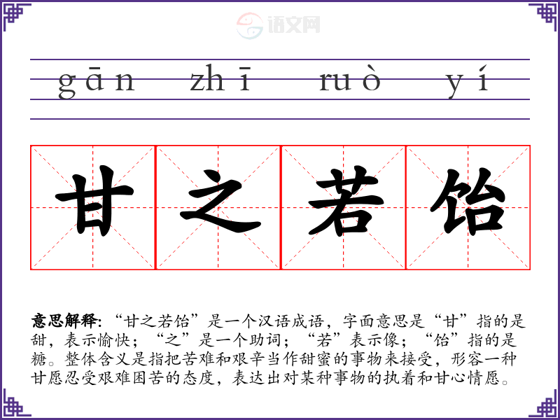 “甘之若饴”是一个汉语成语,字面意思是“甘”指的是甜,表示愉快;“之”是一个助词;“若”表示像;“饴”指的是糖。整体含义是指把苦难和艰辛当作甜蜜的事物来接受,形容一种甘愿忍受艰难困苦的态度,表达出对某种事物的执着和甘心情愿。